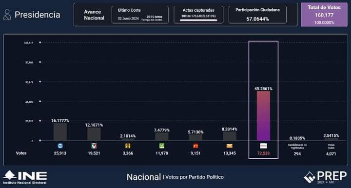 En estos momentos, el Programa de Resultados Preliminares (PREP) muestra que Sheinbaum mantiene una ventaja del 45% sobre su rival más cercana, Xóchitl Gálvez.