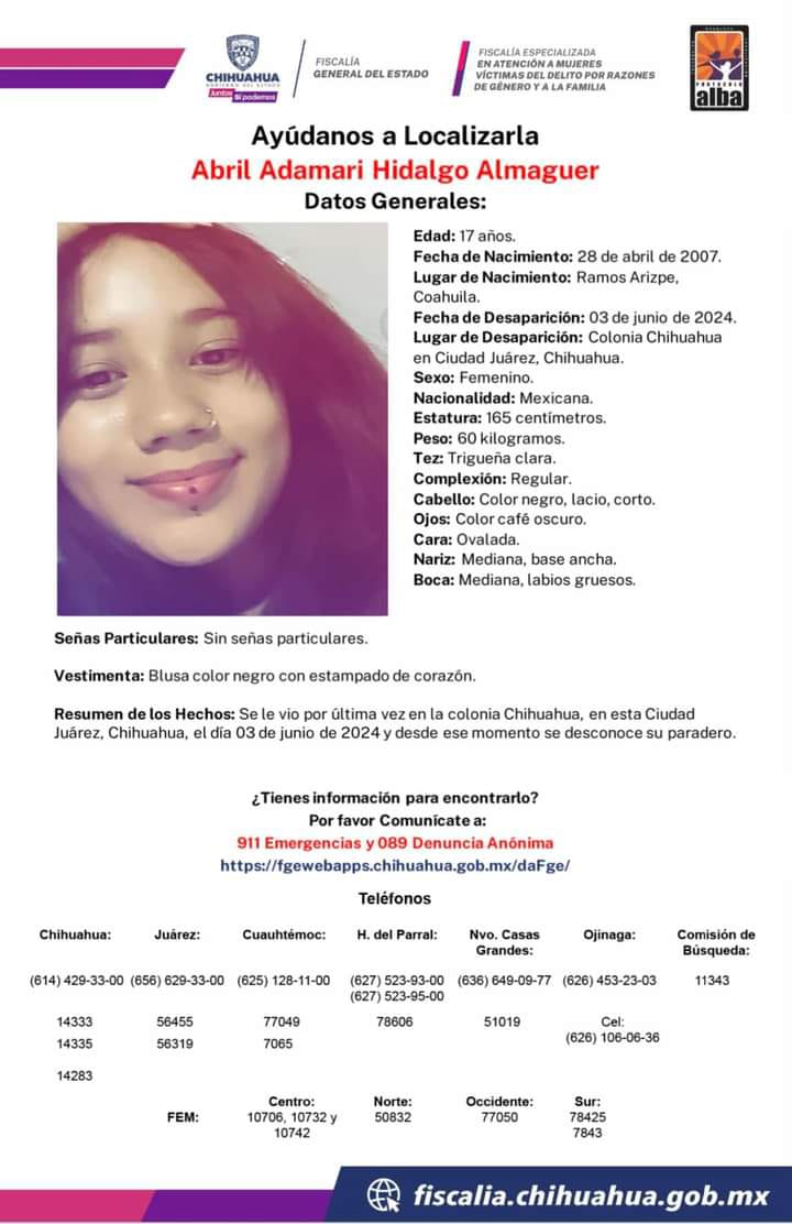 Ciudad Juárez.-La familia de Abril Adamari Hidalgo Almaguer, de 17 años, se encuentra desesperada por conocer su paradero, pues desde el pasado lunes 3 de junio no ha regresado a casa.