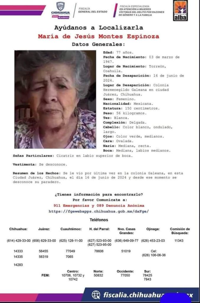 Ciudad Juárez.-Los hijos y nietos de la señora María de Jesús montes Espinoza, de 77 años, se encuentran angustiados por saber sobre su paradero, pues desde el pasado domingo por la tarde salió de su casa y no ha regresado.