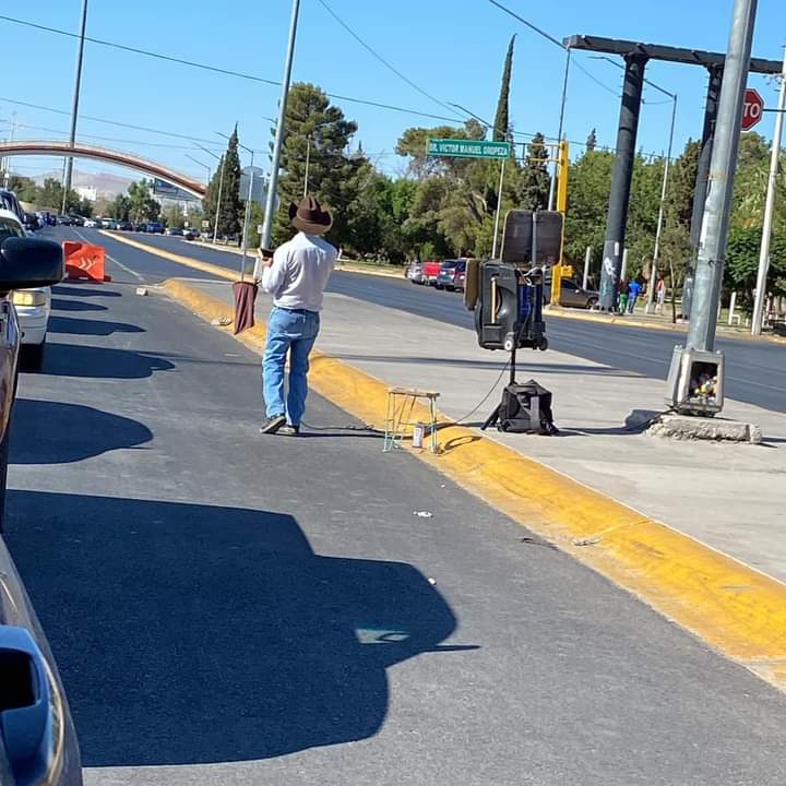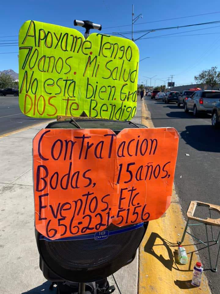 Ciudad Juárez.-Un señor de la tercera edad sale a cantar a inmediaciones del Puente Libre, ofreciendo sus servicios como cantante para fiestas y XV años.