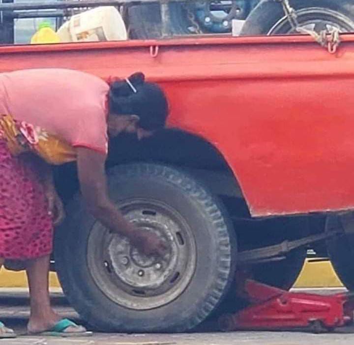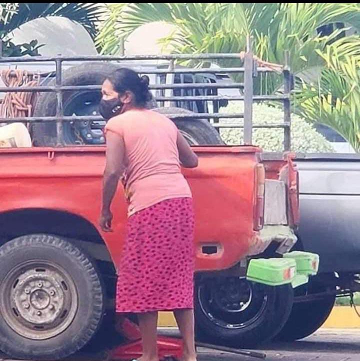 Su esposo andaba trabajando, entregando mercancía y mientras tanto ella se percató que la llanta de la camioneta estaba ponchada, y ella misma se puso a cambiarla.