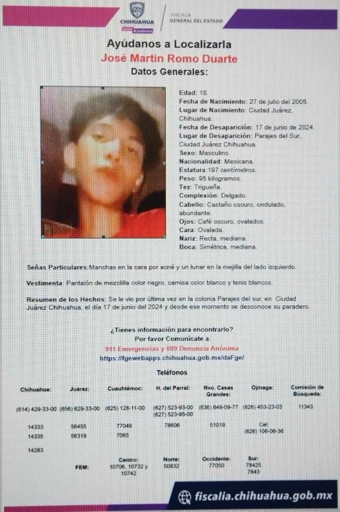José Martin Romo Duarte, de 18 años, fue visto por última vez el pasado 17 de junio en Parajes del Sur, cuando salió de su domicilio y ya no regresó.