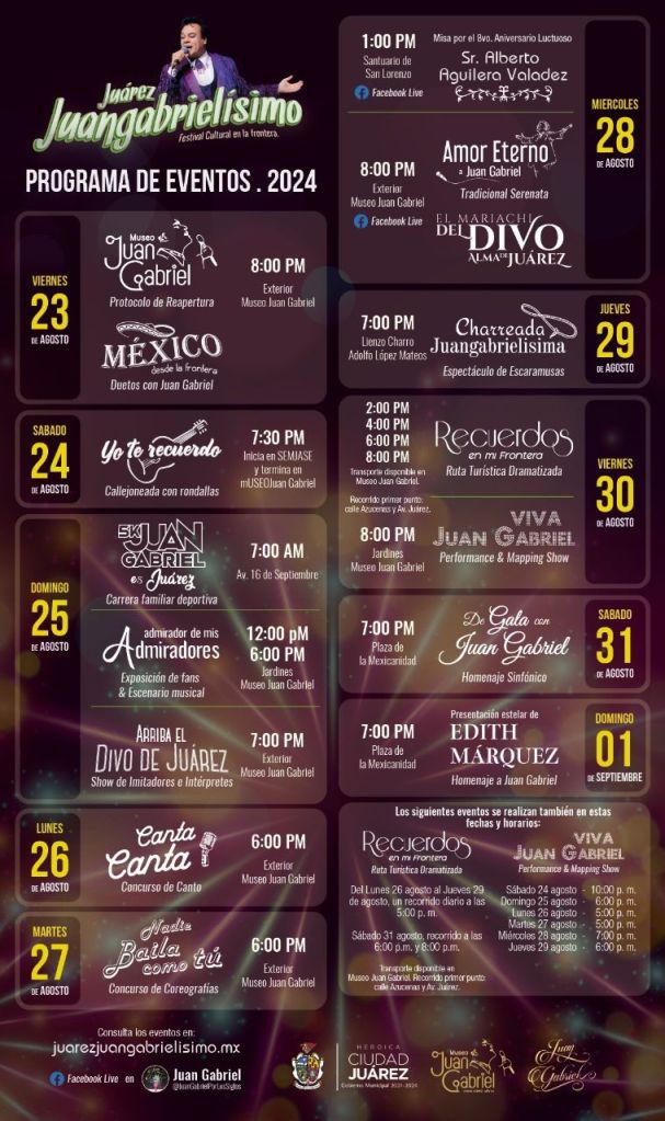 El Festival Juárez Juangabrielísimo 2024 se realizará en plena zona centro, en la que fuera la casa del Gran Divo de Juárez, ubicada en la calle 16 de Septiembre y Perú, a partir del viernes 23 de agosto y hasta el 1 de septiembre.