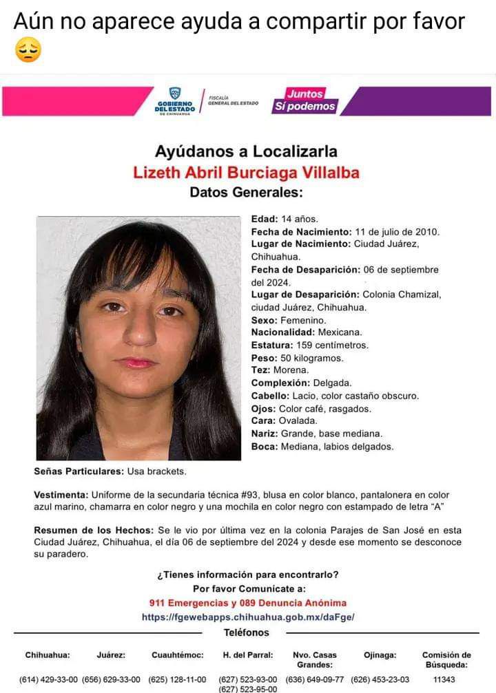 Ciudad Juárez.-La jovencita Lizeth Abril Burciaga Villalba, de apenas 14 años, desapareció desde el pasado viernes 6 de Septiembre, cuando iba camino a la secundaria técnica #93.