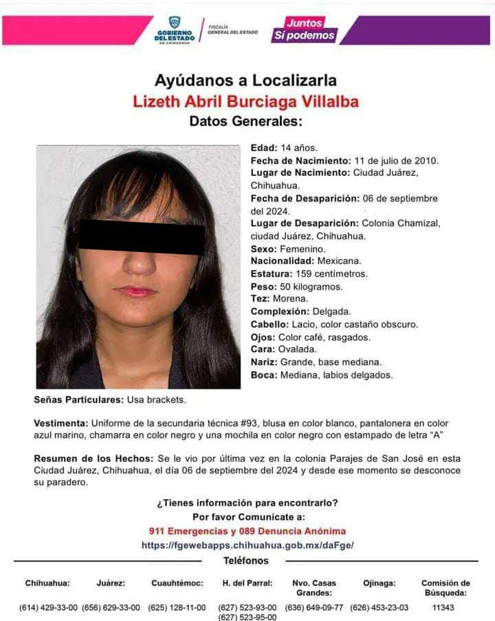 Ciudad Juárez.-A doce días de su desaparicion, hoy fue localizada sin vida la jovencita de apenas 14 años, Lizeth Abril Burciaga, quien había desaparecido cuando iba camino a su escuela.