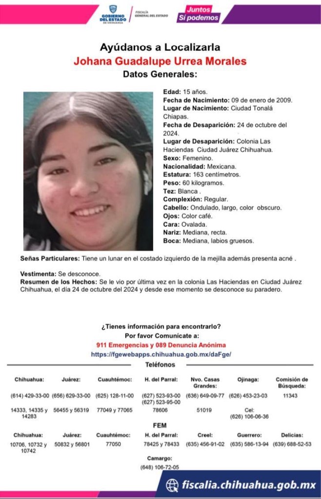 Johana Guadalupe Urrea Morales de 15 años, lleva desaparecida desde el 24 de octubre, causando un gran dolor y desesperación en su familia y amigos.