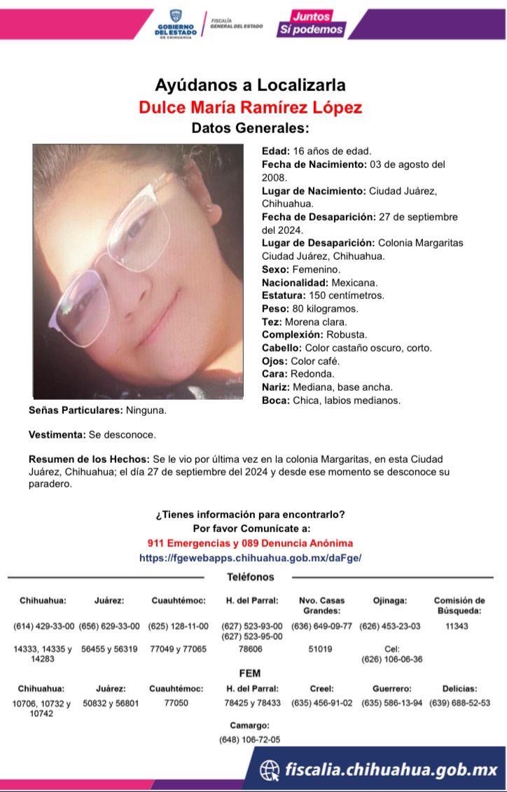 Dulce María Ramírez López de 16 años, lleva desaparecida desde el 27 de septiembre, causando un gran dolor y desesperación en su familia y amigos.