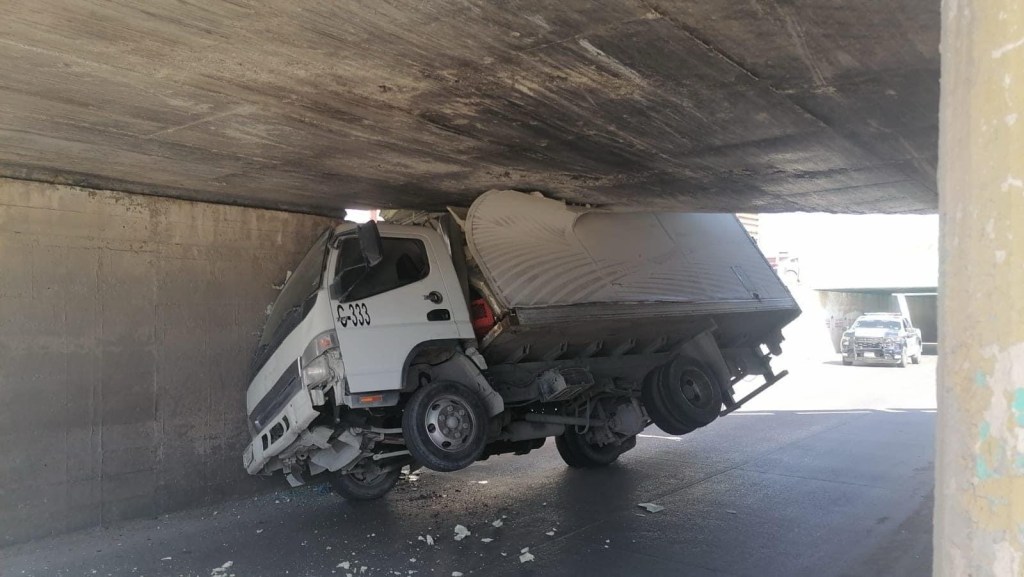 Un camión de leche Lucerna quedó atrapado en el techo del viaducto Díaz Ordaz. Testigos presenciaron el momento en que el vehículo intentó pasar, sólo para quedarse atascado, bloqueando el paso y generando caos vial en la zona.