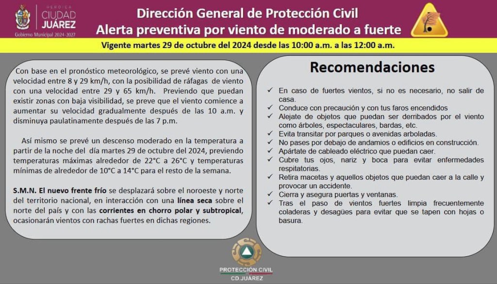 Protección Civil de Ciudad Juárez emitió una alerta por vientos de moderados a fuertes para el martes 29 de octubre, de 10:00 a.m. a 12:00 a.m. Las ráfagas podrían alcanzar hasta 65 km/h.