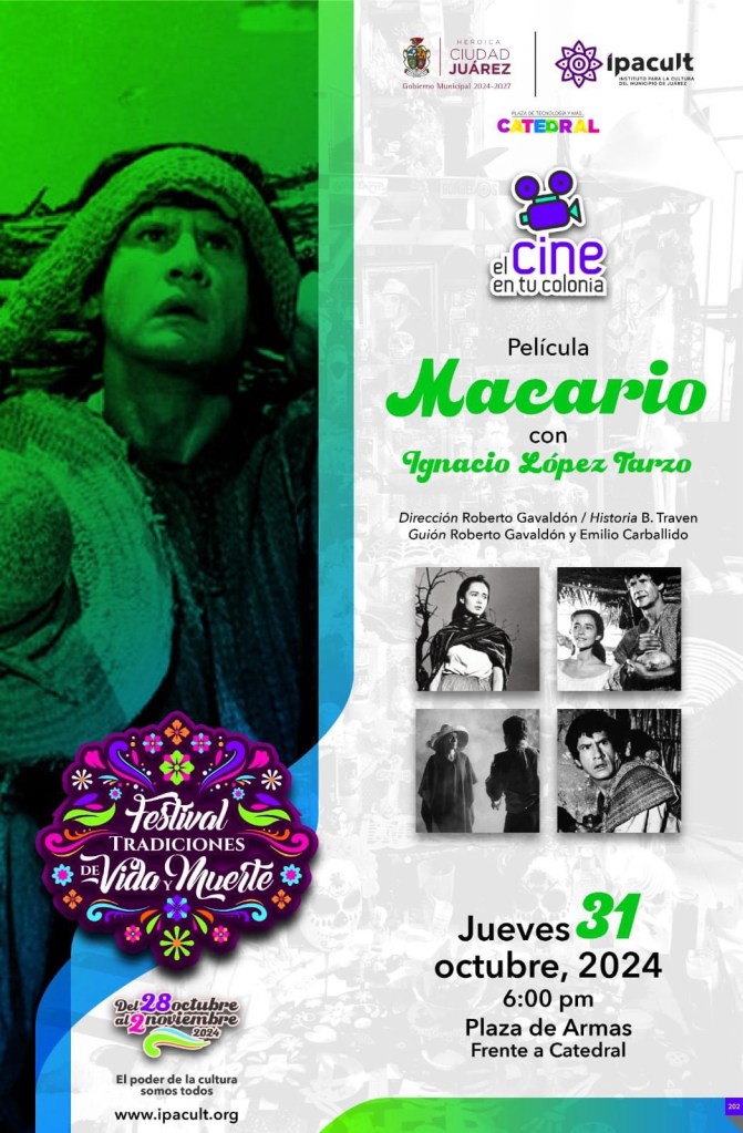 Por el festival de tradiciones de Vida y Muerte, promovido por el Instituto Para la Cultura del Municipio de Juárez y para seguir con la temática de Día de Muertos, la película a proyectar será Macario y comenzará su proyección en punto de las 6 pm frente a catedral.