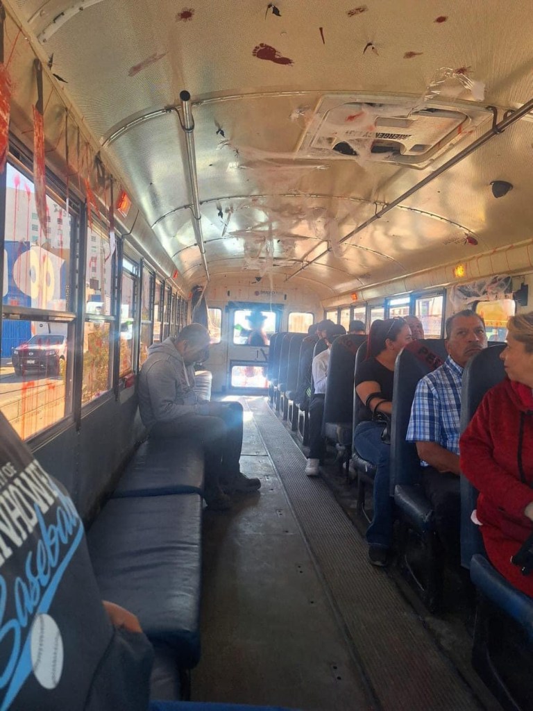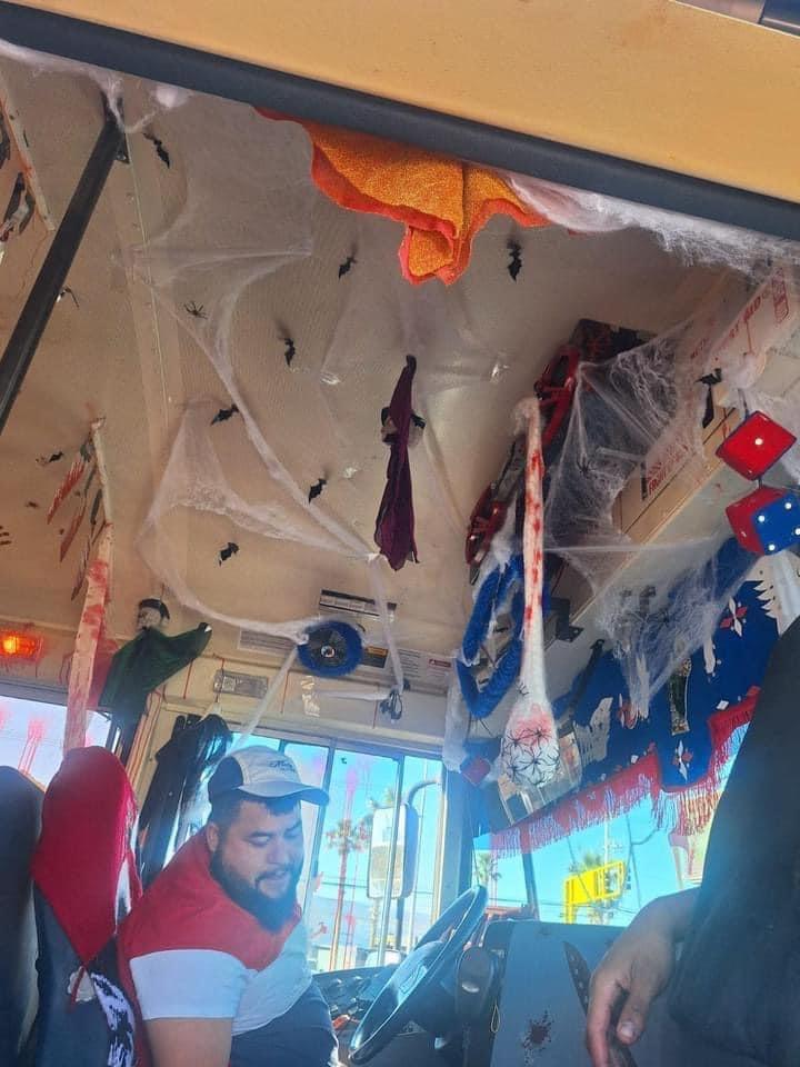 El chofer de la rutera 65 de la línea Express se contagió de la celebración del Halloween y está dando dulces a los pasajeros que abordan el camión.