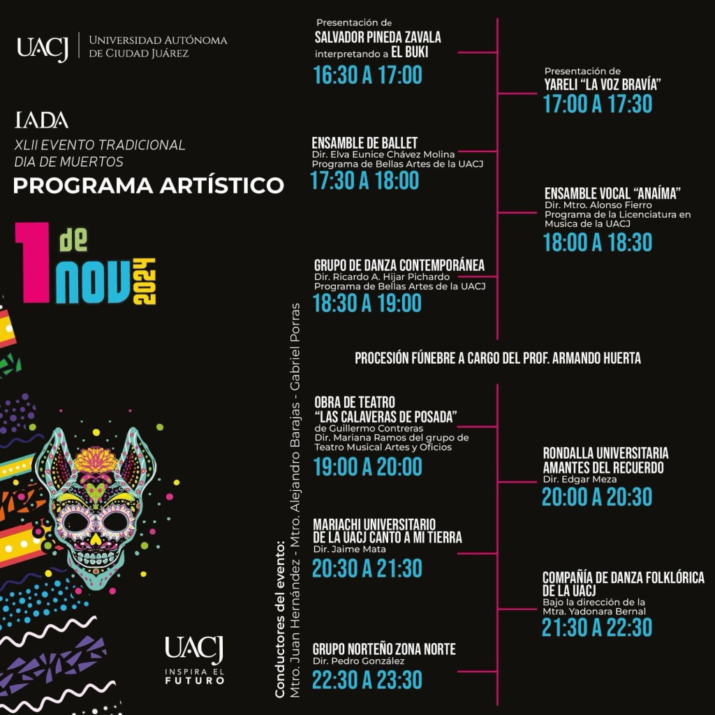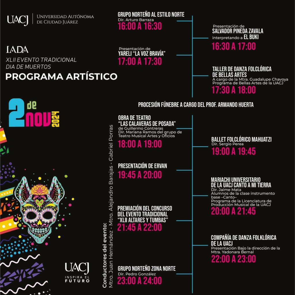 La tradición de altares y tumbas se vive con entusiasmo en el campus IADA de la UACJ. En este evento, los asistentes pueden disfrutar de exposiciones de altares, música en vivo, y un ambiente cultural único.