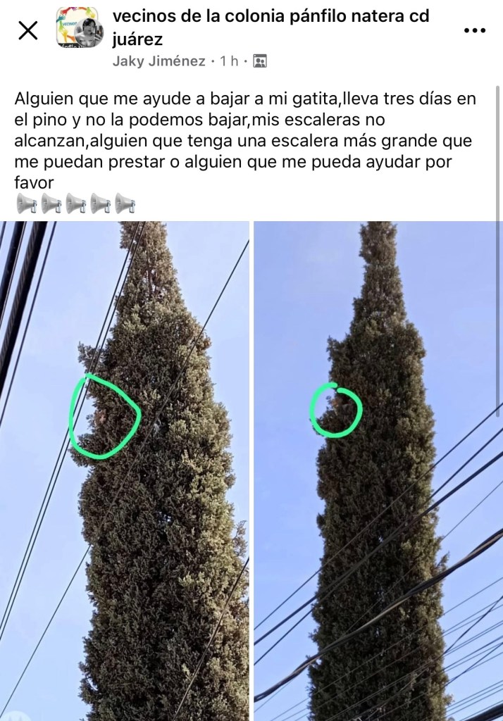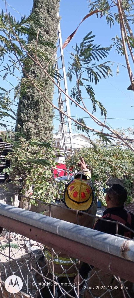 El Heroico Cuerpo de Bomberos salió al rescate de una pobre gatita que tenía tres días varada en lo alto de un pino. Después de las maniobras necesarias, la gatita fue regresada con su dueña.