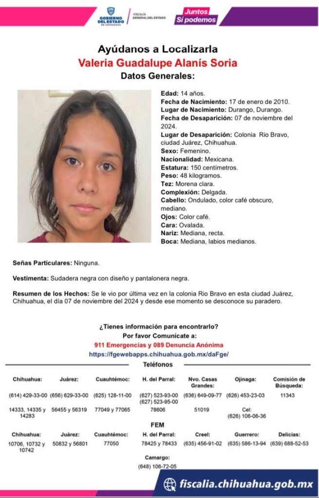 Hoy ellos piden el apoyo de los juarenses para poder localizarlas y que regresen a casa. Lo última vez que se le vio fue en la colonia Río Bravo y desde ese momento se desconoce su paradero.