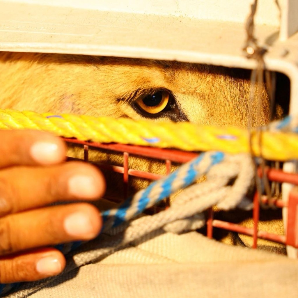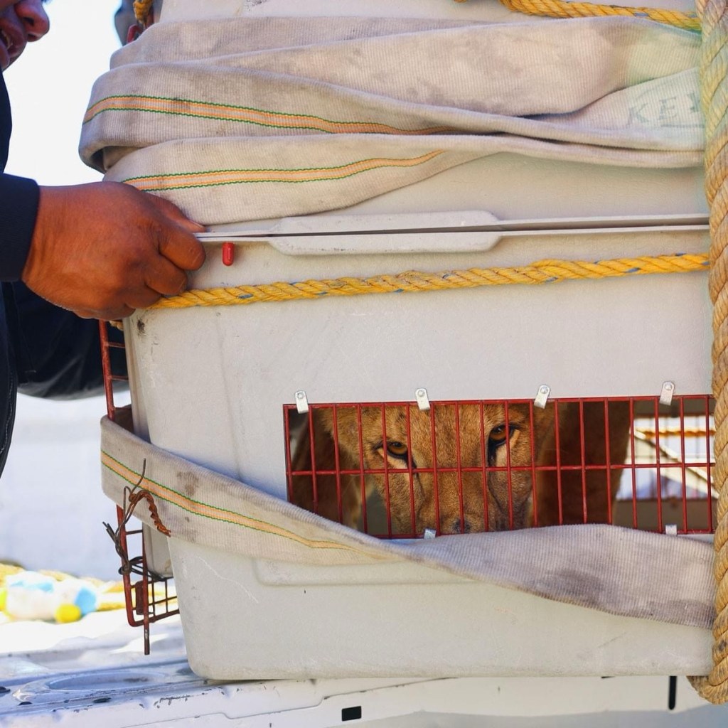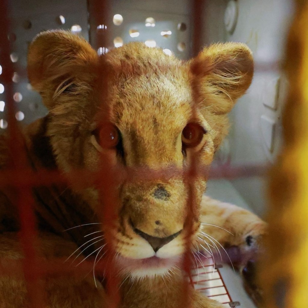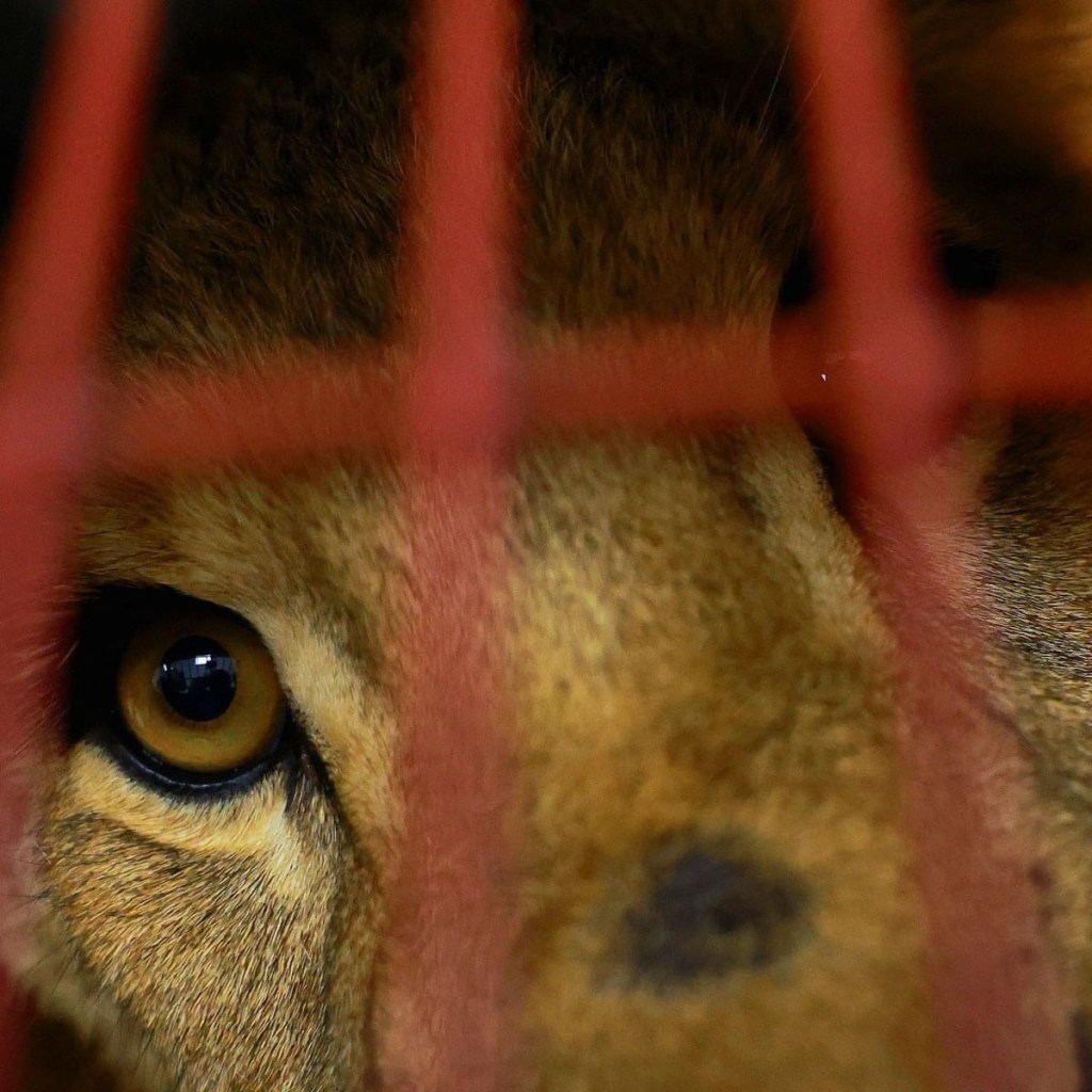 En la imagen, la leona observa desde el interior de una jaula justo después de su rescate.