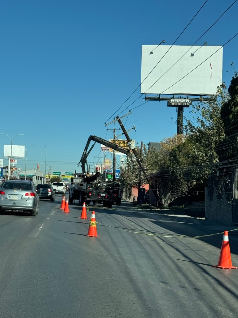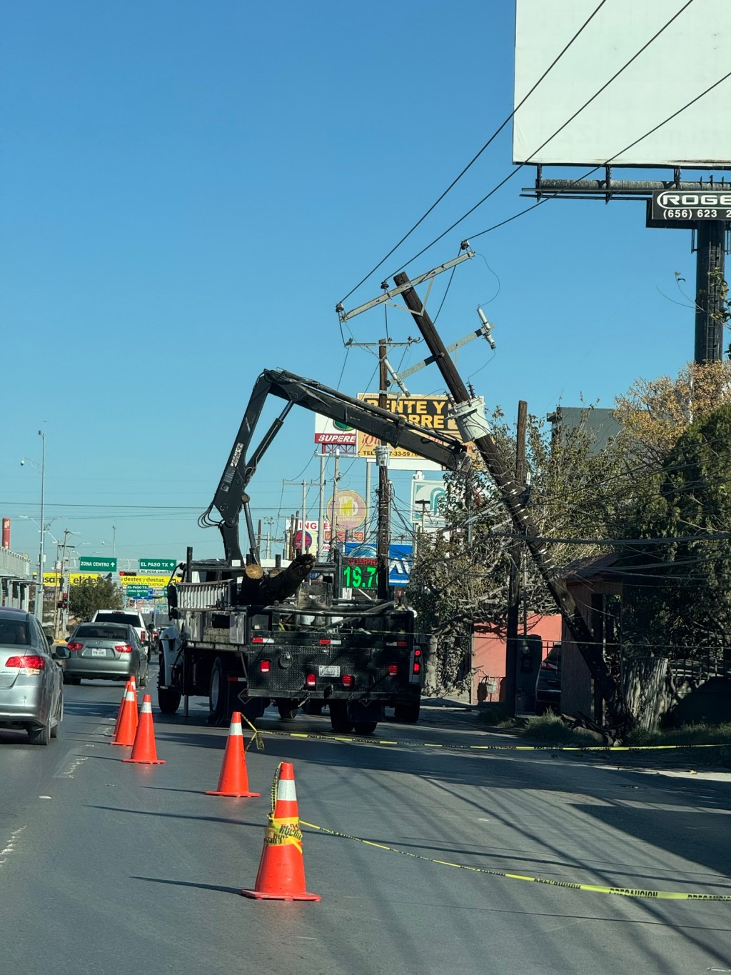 Personal de CFE maniobran con un poste que está por caerse en la avenida Panamericana antes de llegar a Rancho Agua Caliente (Pradera Dorada). Tráfico muy lento.
