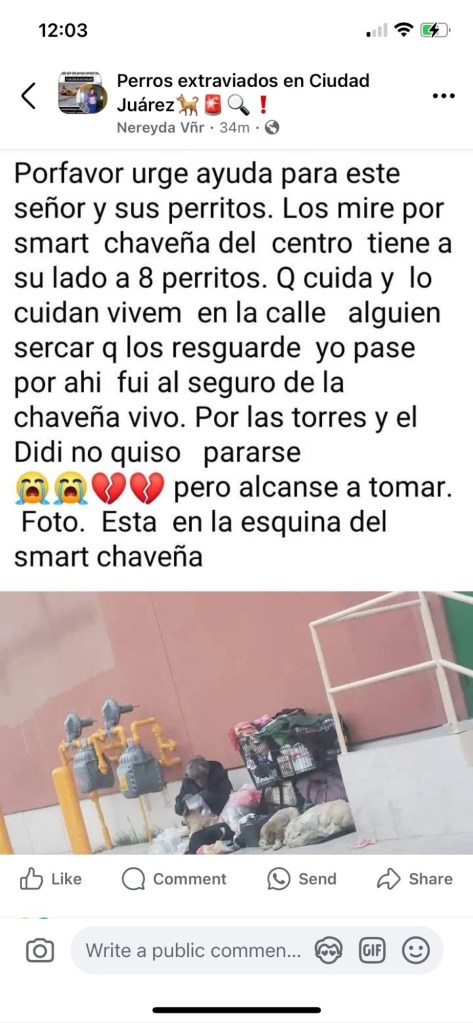 El señor ya tiene tiempo viviendo en Smart Chaveña y a los alrededores, cuando no está ahí anda cerca, tiene a 8 perritos, 3 de ellos cachorritos de dos meses que según comentan personas que lo conocen, una señora fue a dejárselos ahí porque ya ni los quería. El abuelito necesita alimento, ropa abrigada y sus perritos necesitan suetercitos, esterilizarlos, vacunas, croquetas y sobre todo, un lugar fijo donde poder vivir junto con sus perritos, las temperaturas congelantes son un peligro para el abuelito y sus perritos. 🙁