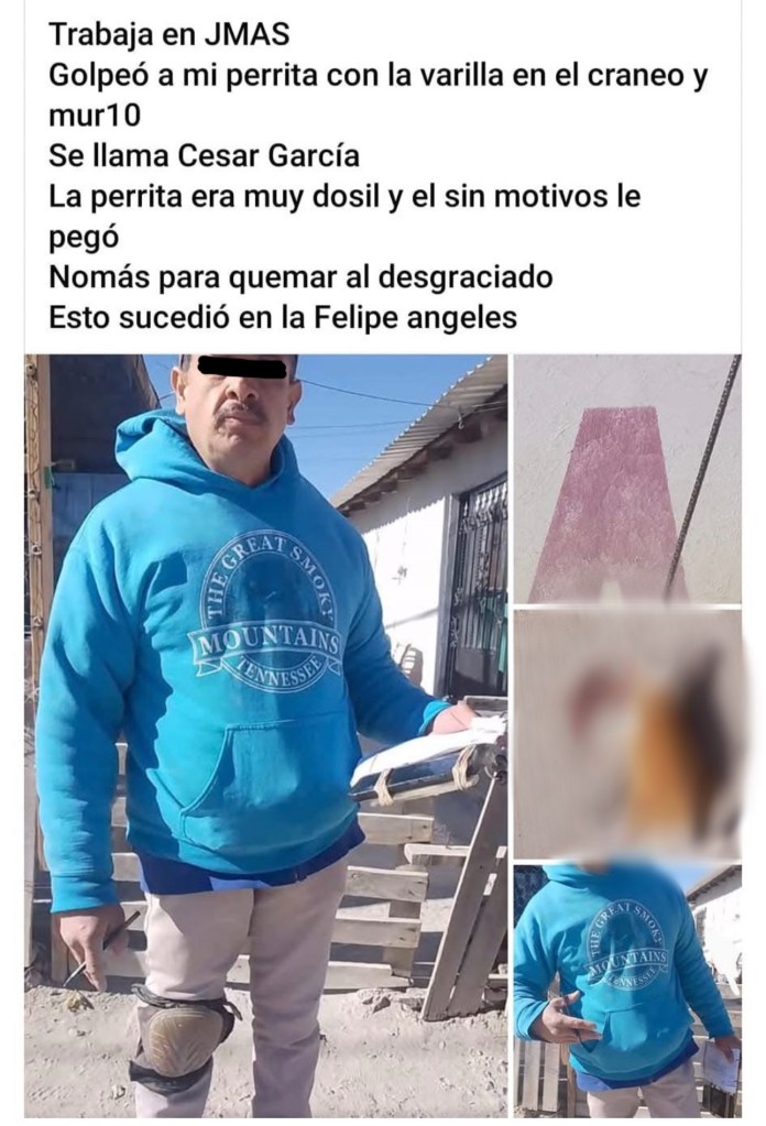 La denuncia en redes menciona que un hombre identificado como César García, presuntamente trabajador de la JMAS, golpeó a una perrita con una varilla. El incidente ocurrió en la colonia Felipe Ángeles, donde vecinos reportaron que la mascota murió tras el ataque.
