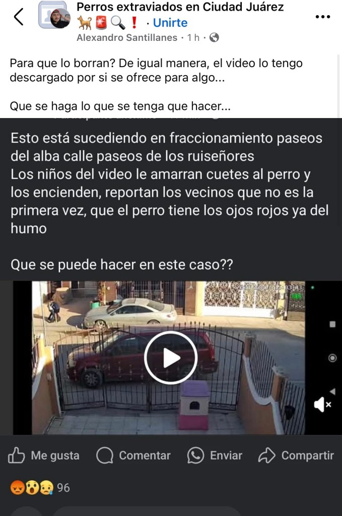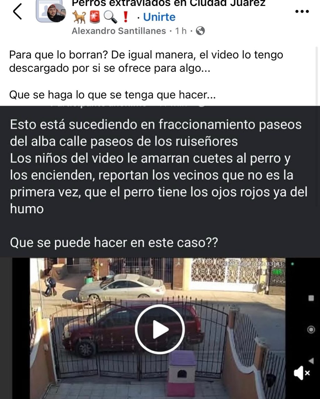 A través de redes sociales, esta tarde se ha viralizado un video de una cámara de seguridad que captura el momento en el que unos niños, aparentemente del fraccionamiento Paseos del Alba, le amarran pirotecnia (cohetes) a un perrito de situación de calle.
