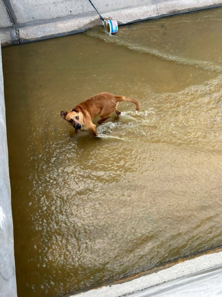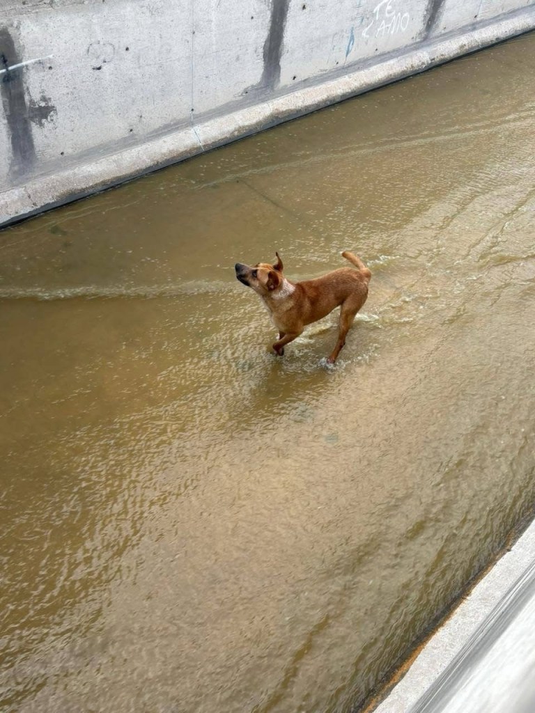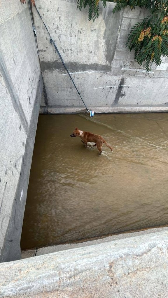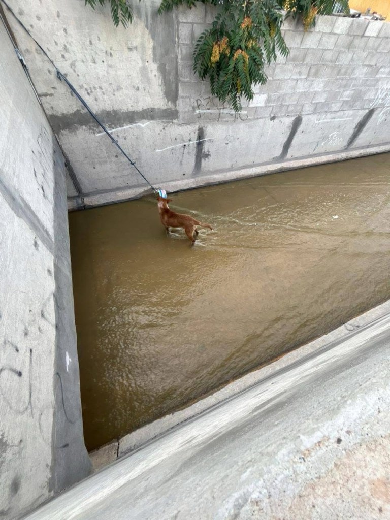 Elementos de Protección Civil rescataron a un perro atrapado en un canal de agua pluvial en la colonia Azteca.
