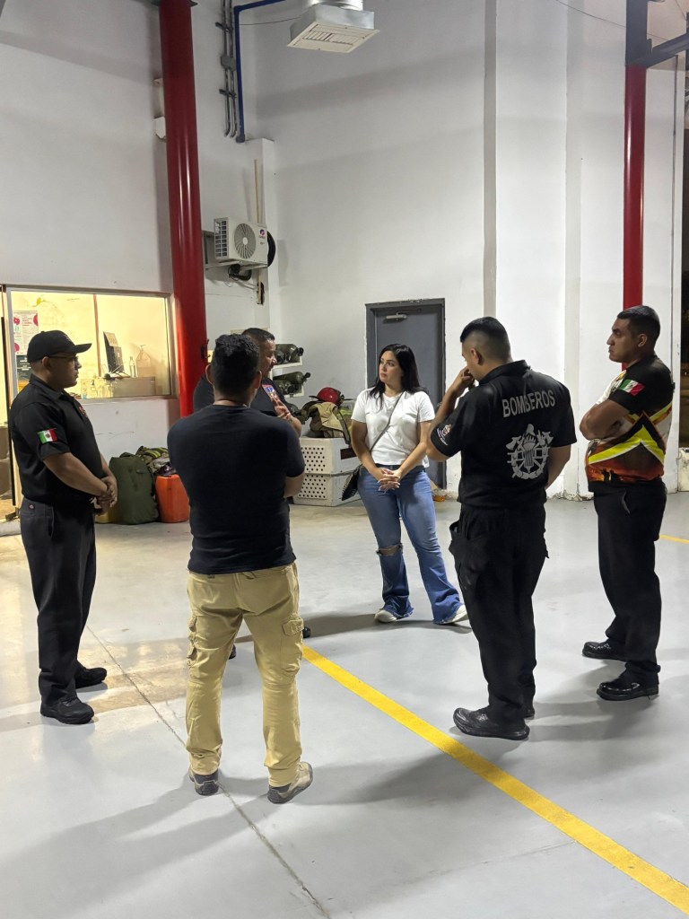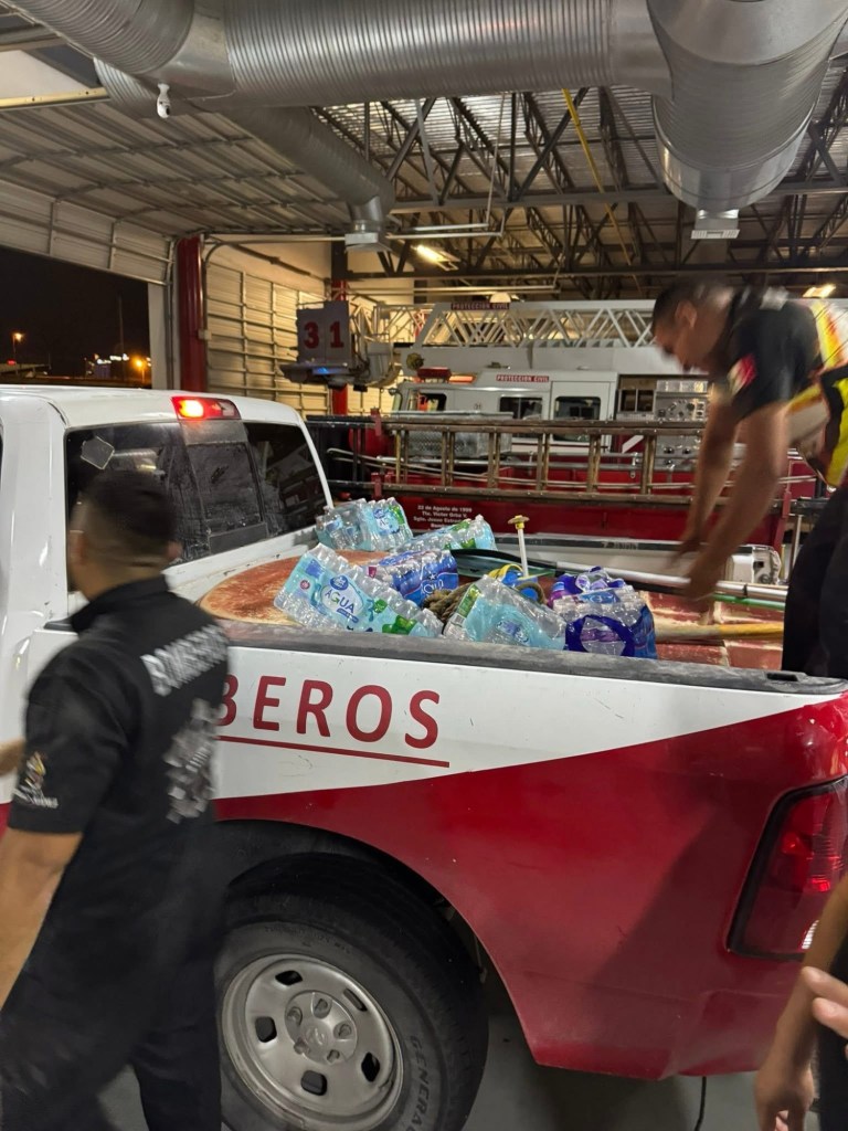Durante el recorrido, entregó pizzas y agua a bomberos y personal de Protección Civil como muestra de respaldo por sus labores en campo.