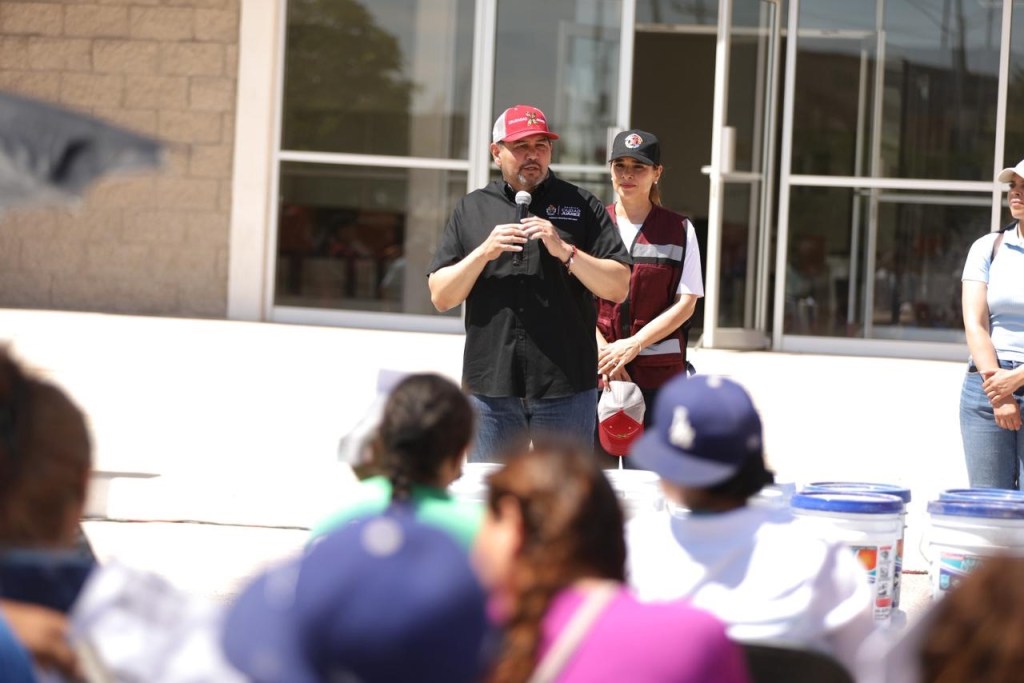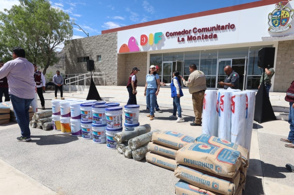 El Presidente Municipal, Cruz Pérez Cuéllar, entregó kits con cemento, impermeabilizante y pintura a cien familias afectadas por lluvias en el norponiente de Ciudad Juárez.