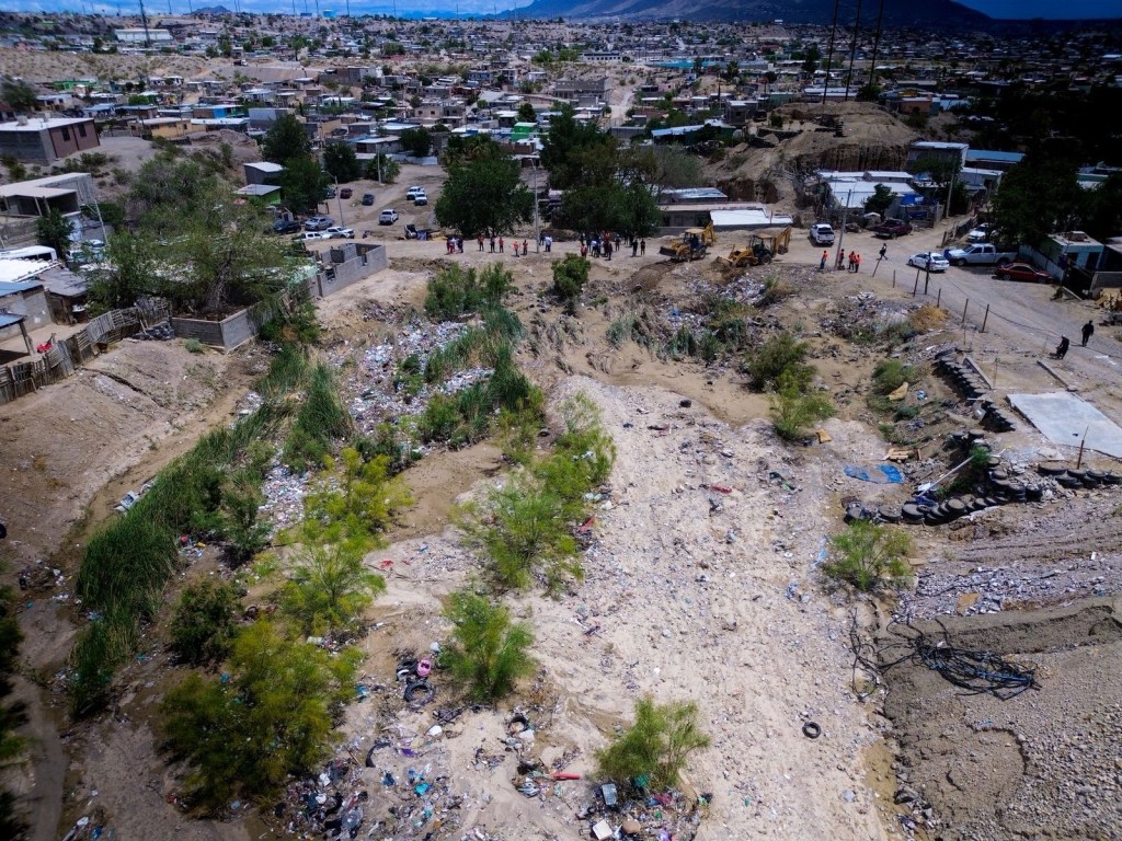Personal de la Junta de Agua y Saneamiento de Juárez realizó limpieza urgente en el dique de la colonia Plutarco Elías Calles para prevenir inundaciones.