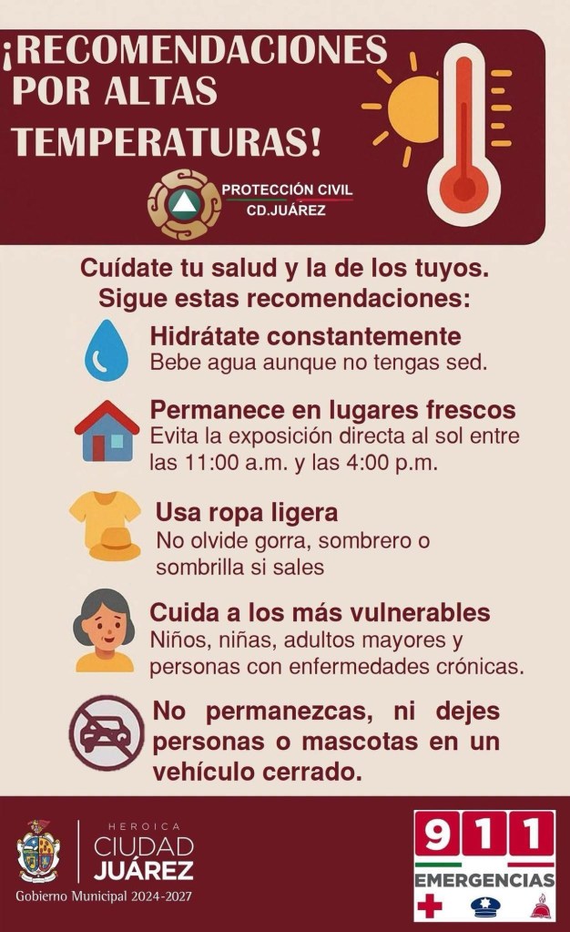 Ciudad Juárez espera este domingo una temperatura máxima de 38 °C y mínima de 25 °C, con viento moderado y posibilidad de lluvia del 10 al 20 %.