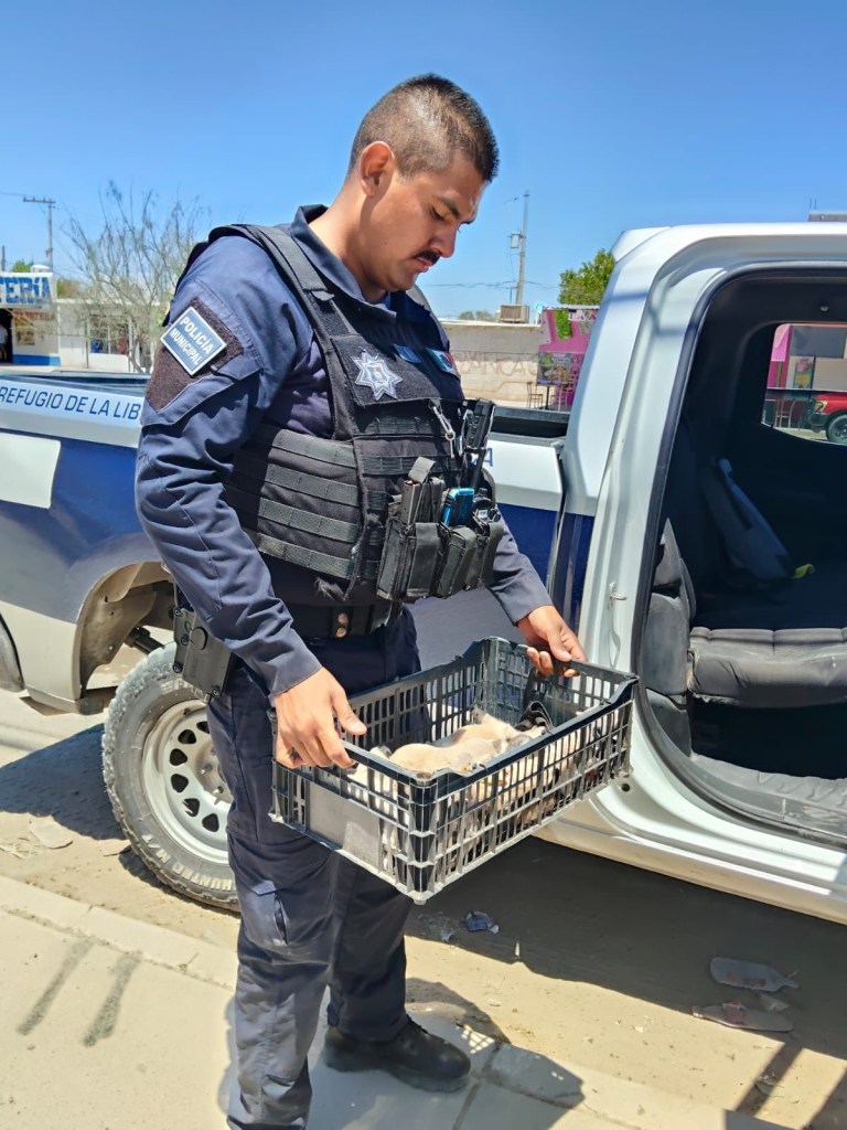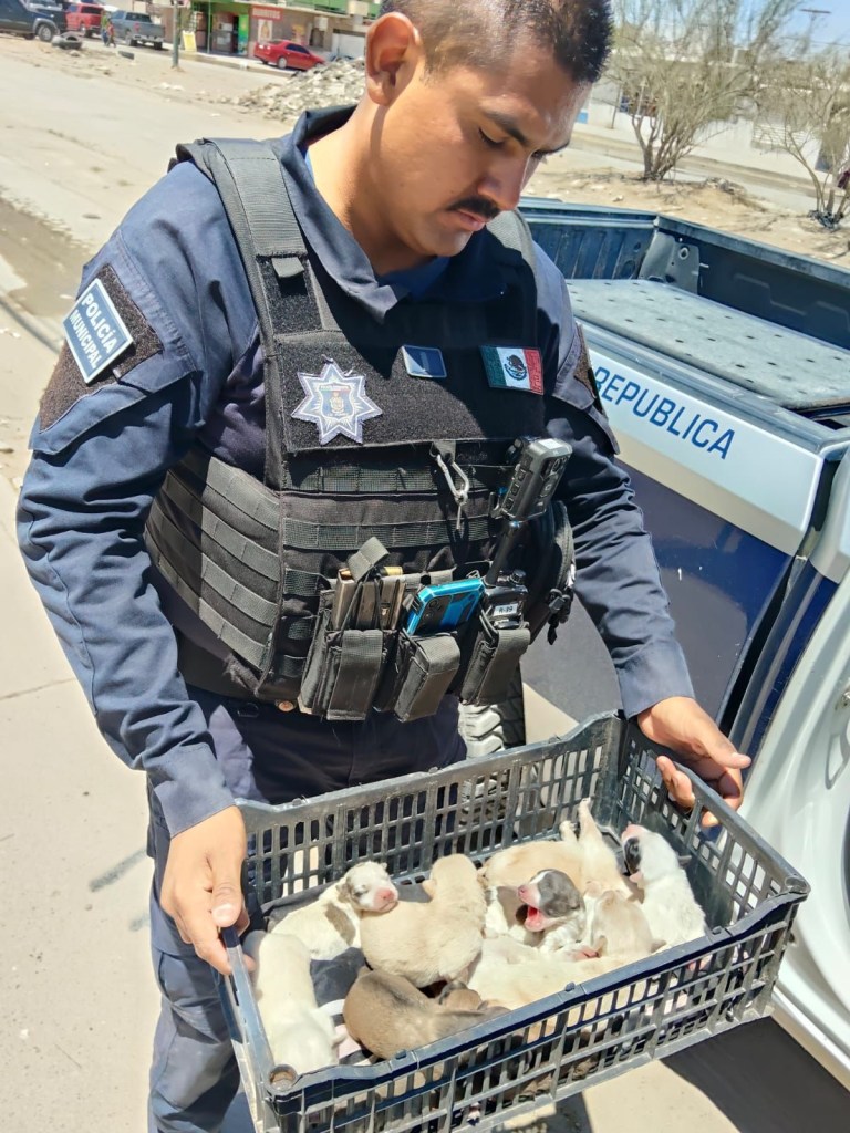 Agentes municipales aseguraron a nueve cachorros tras recibir un reporte sobre abandono en un lote baldío ubicado en la colonia Vistas de Zaragoza.