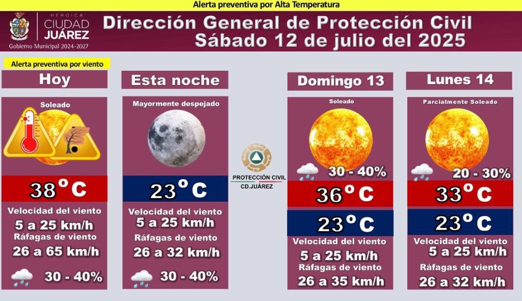 Protección Civil de Ciudad Juárez activó una alerta preventiva por calor extremo y vientos fuertes para este sábado 12 de julio en toda la región.