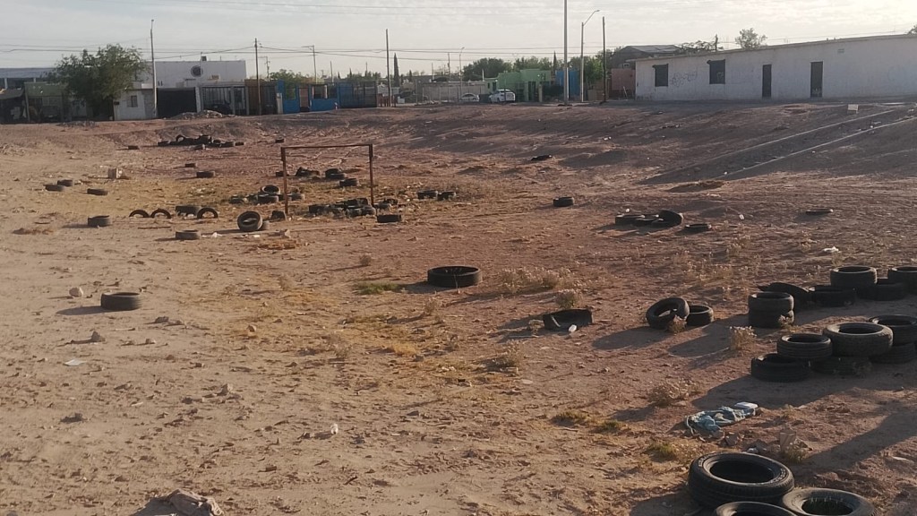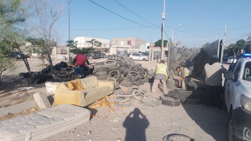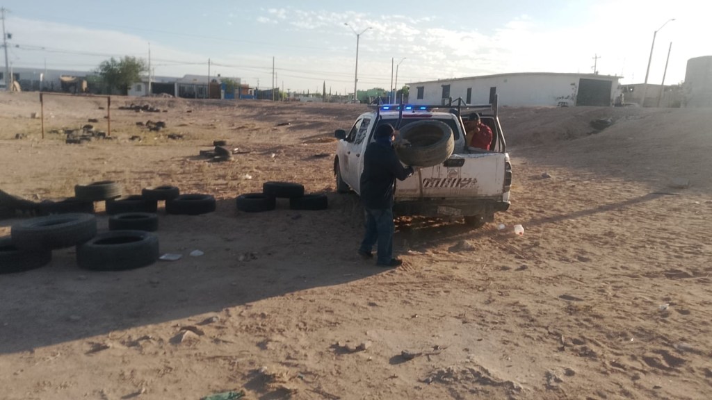 Cuadrillas de Limpia acudieron a la colonia Médanos en Cd. Juárez para apoyar con un operativo de recolección de llantas y tiliches, entre las calles Anís y Verbena.