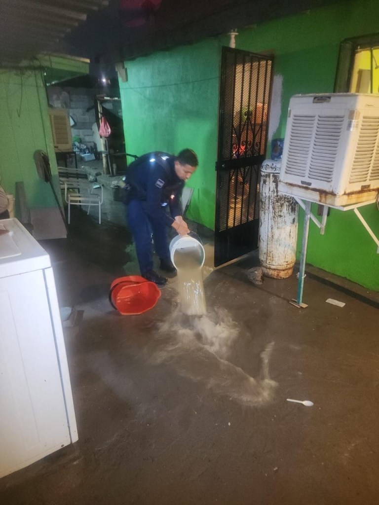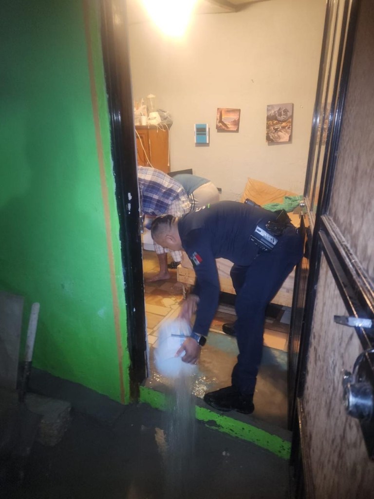 El agua se filtraba en su vivienda, por lo que los agentes actuaron con rapidez. Con cubetas y escobas, ayudaron a sacar el agua acumulada.