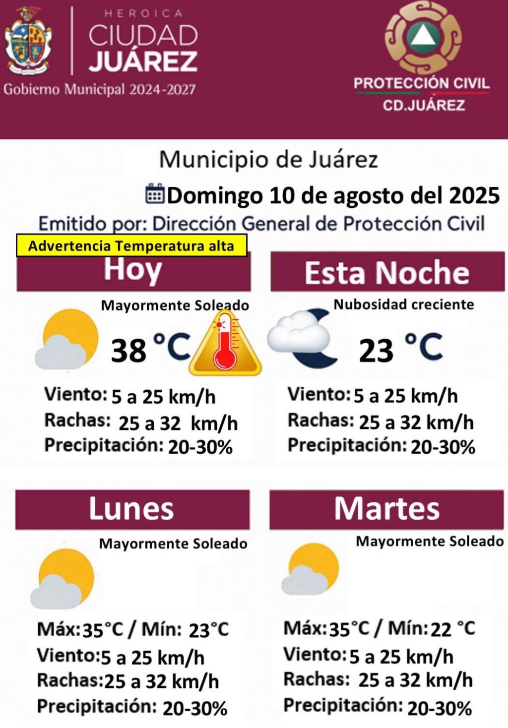 Protección Civil de Cd. Juárez informó que este 10 de agosto la temperatura máxima será de 38 grados y la mínima de 23 grados en la región fronteriza.