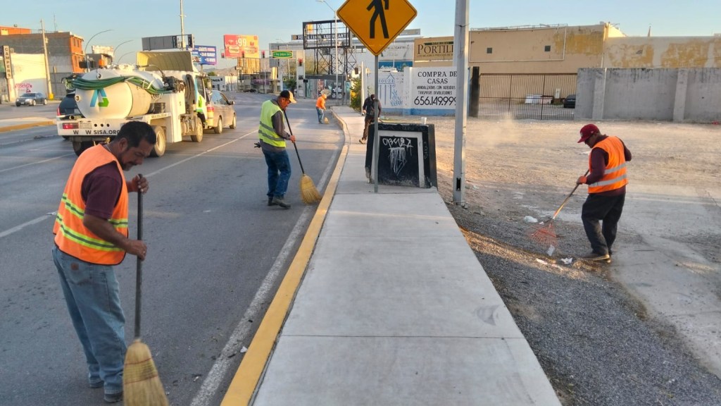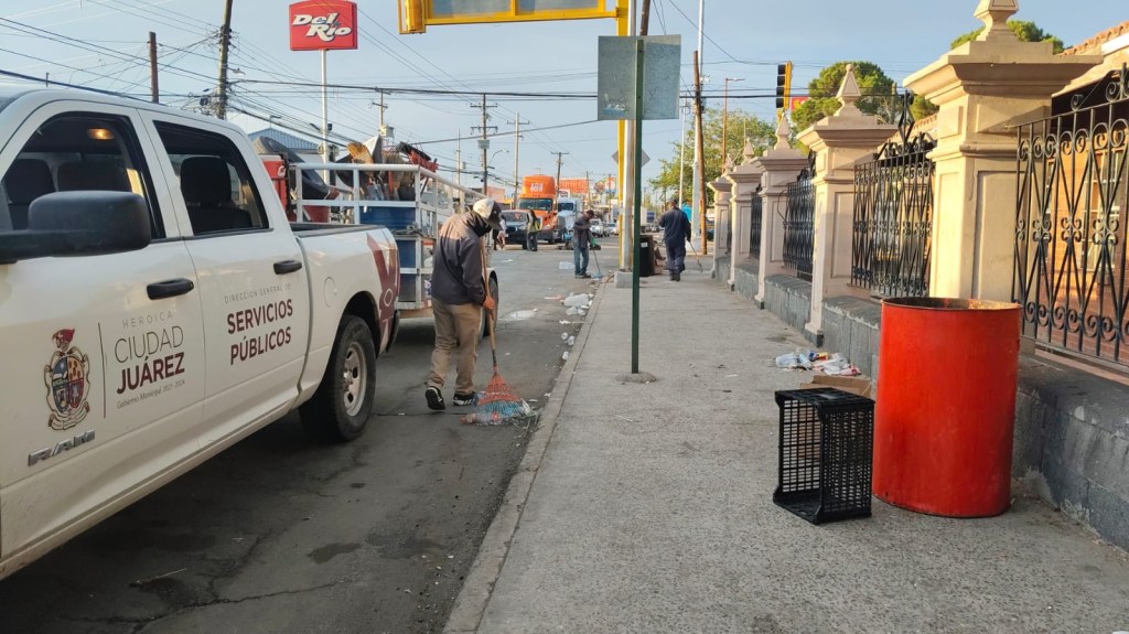 Las cuadrillas trabajaron desde temprano para vaciar contenedores y limpiar banquetas, dejando la zona limpia, aunque la cantidad de desechos habla del desorden dejado.
