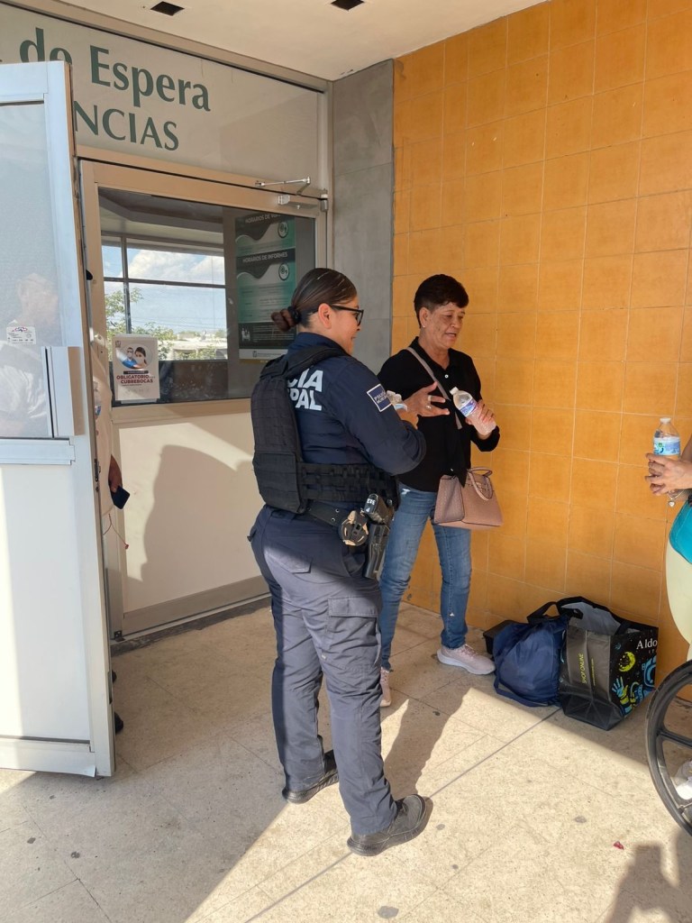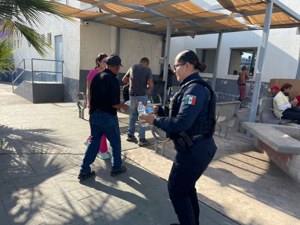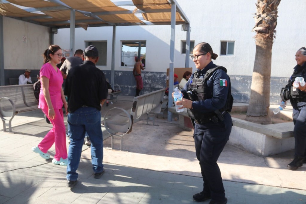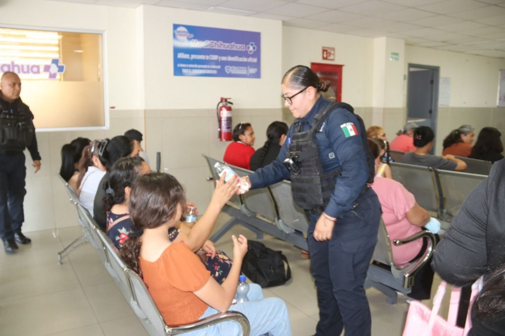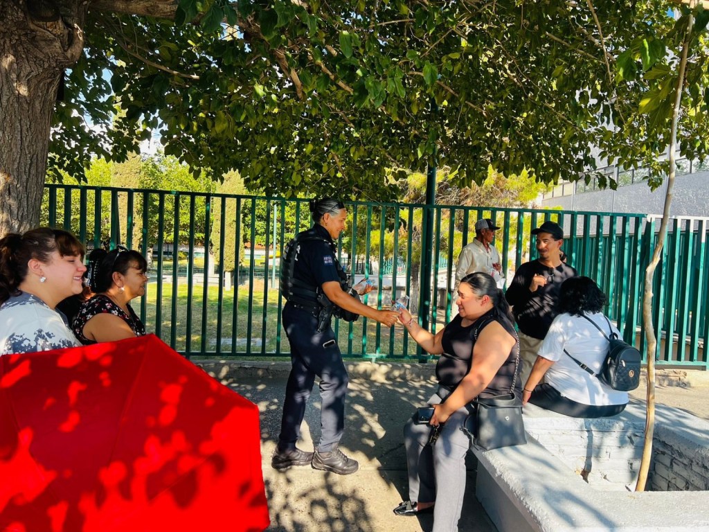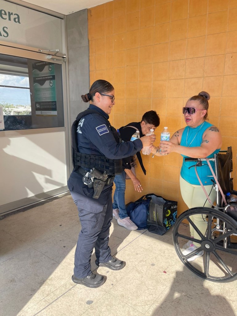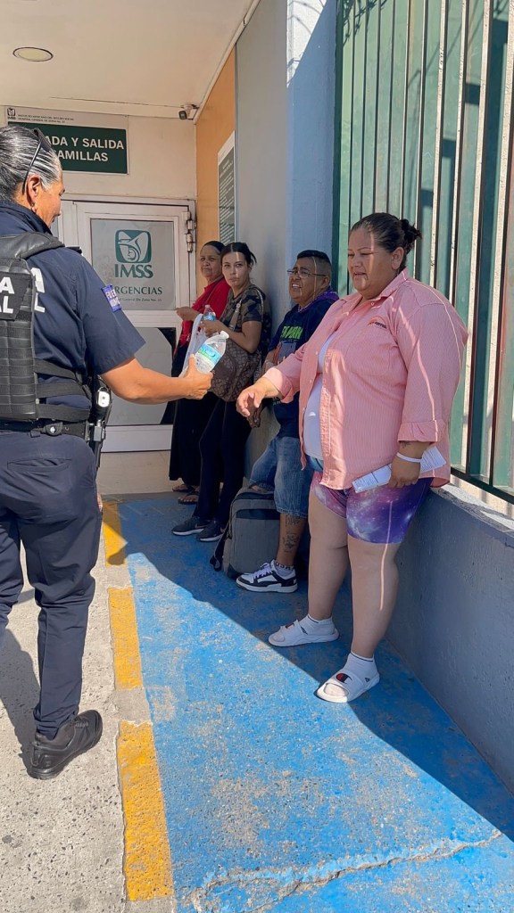 Agentes de la Secretaría de Seguridad Pública Municipal entregaron agua embotellada en diferentes hospitales de Ciudad Juárez, apoyando a familiares de pacientes que permanecían en exteriores bajo temperaturas elevadas.