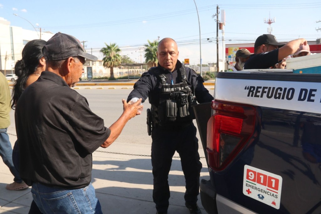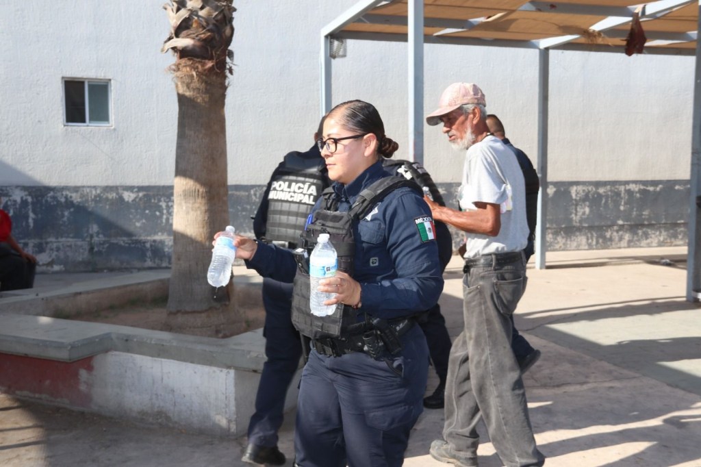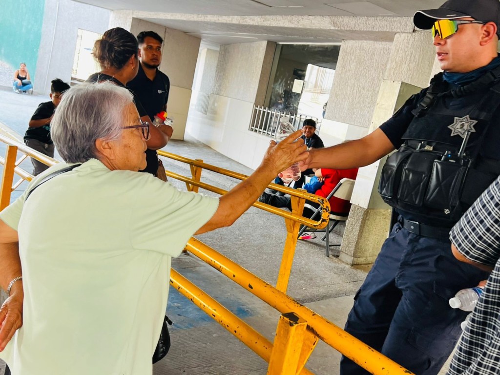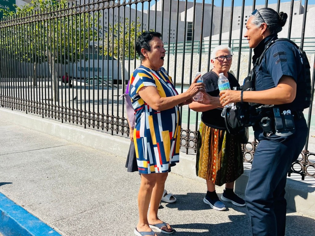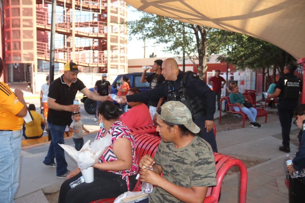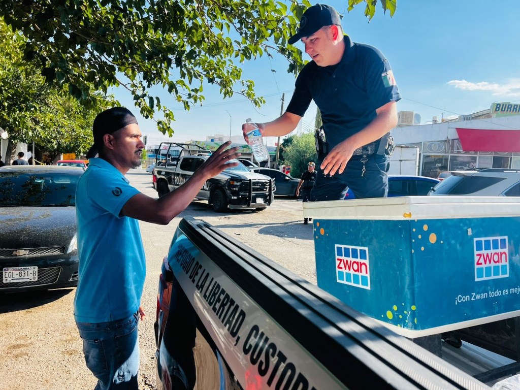 Agentes de la Secretaría de Seguridad Pública Municipal entregaron agua embotellada en diferentes hospitales de Ciudad Juárez, apoyando a familiares de pacientes que permanecían en exteriores bajo temperaturas elevadas.