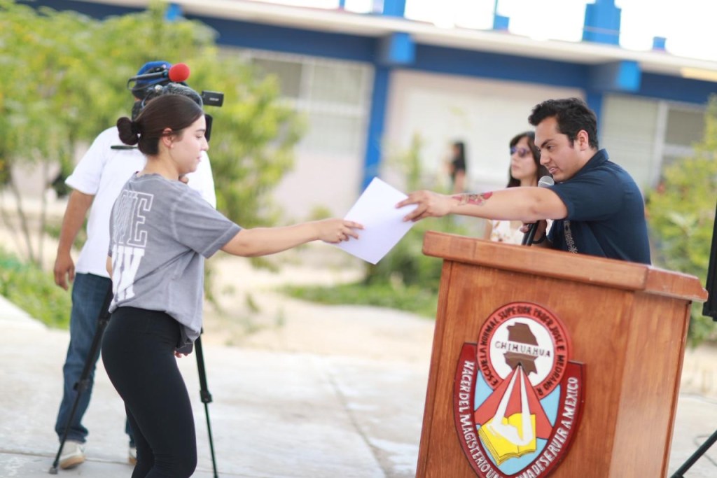La ceremonia fue encabezada por Luis Osvaldo Rivas García y coordinada por Darío Gael Martínez Gómez, con la presencia de Julio César López, director de la Normal, entregando apoyos simbólicos a los jóvenes.