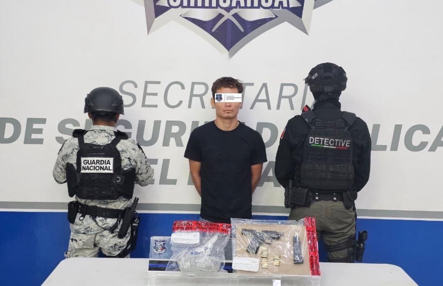 Posteriormente, se cateó un domicilio en la colonia Carlos Castillo Peraza, asegurándose armas, cartuchos, chalecos con insignias de la policía municipal, envoltorios con hierba verde. Todo fue embalado y entregado al Ministerio Público como evidencia relevante.