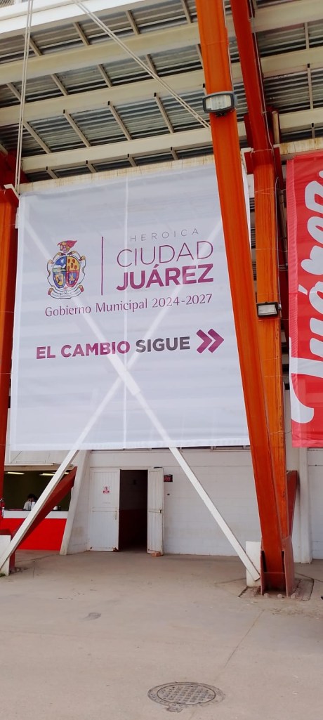 El Gobierno del Estado, retiró la publicidad municipal en el Estadio Juárez para colocar la propia, a pocas horas de celebrarse la final Indios-Dorados.