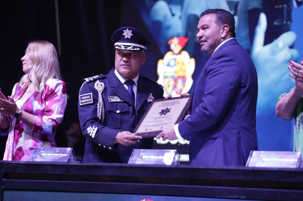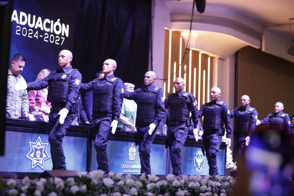 El presidente municipal Cruz Pérez Cuéllar reconoció el sacrificio y compromiso de los nuevos policías, destacando la importancia de su labor para la seguridad de la comunidad juarense.