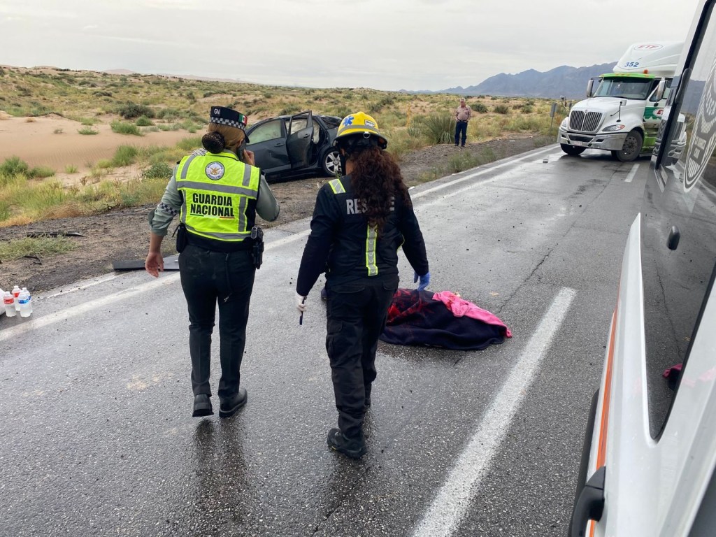 Personal de Rescate acudió al kilómetro 306 de la carretera Juárez–Chihuahua para atender la volcadura de un vehículo particular que dejó víctimas.