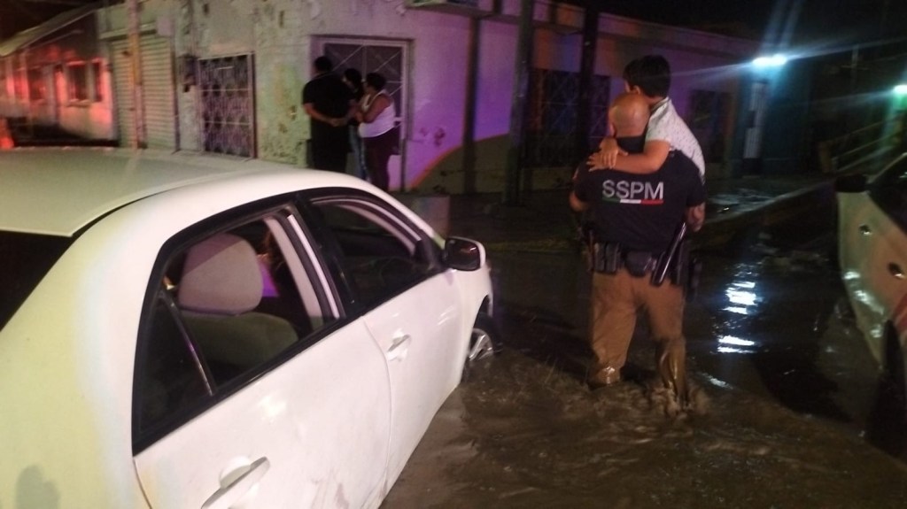 Agentes de la Secretaría de Seguridad Pública Municipal auxiliaron a una familia que quedó atrapada dentro de su vehículo, luego de las fuertes lluvias registradas en la colonia Barrio Alto.
