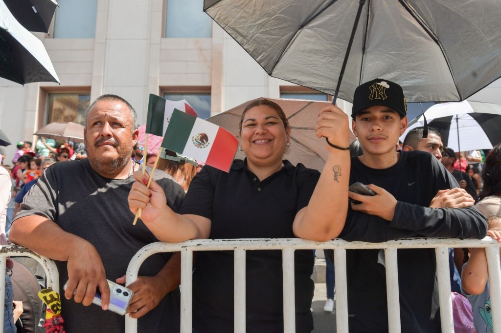 Maru Campos estuvo acompañada por autoridades militares y estatales, observando el paso de comitivas abanderadas por Ejército Mexicano, Fuerza Aérea, Guardia Nacional, Seguridad Pública, Protección Civil, Cruz Roja y agrupamientos educativos.