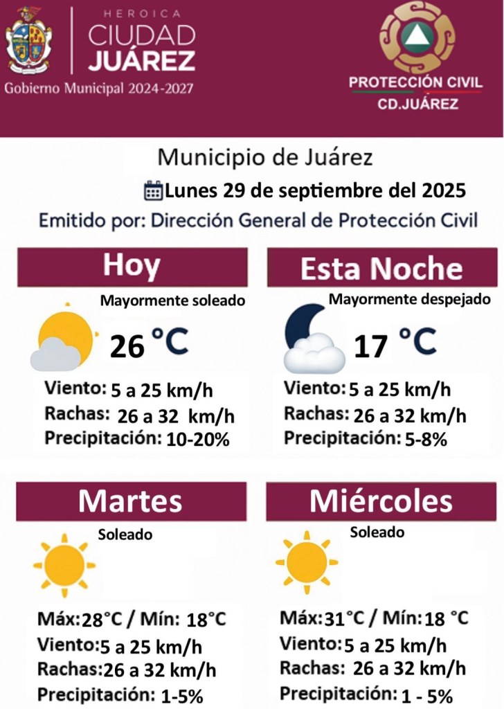 La Dirección General de Protección Civil de Juárez informó el pronóstico del clima para este lunes 29 de septiembre de 2025 y los días siguientes en la región fronteriza.