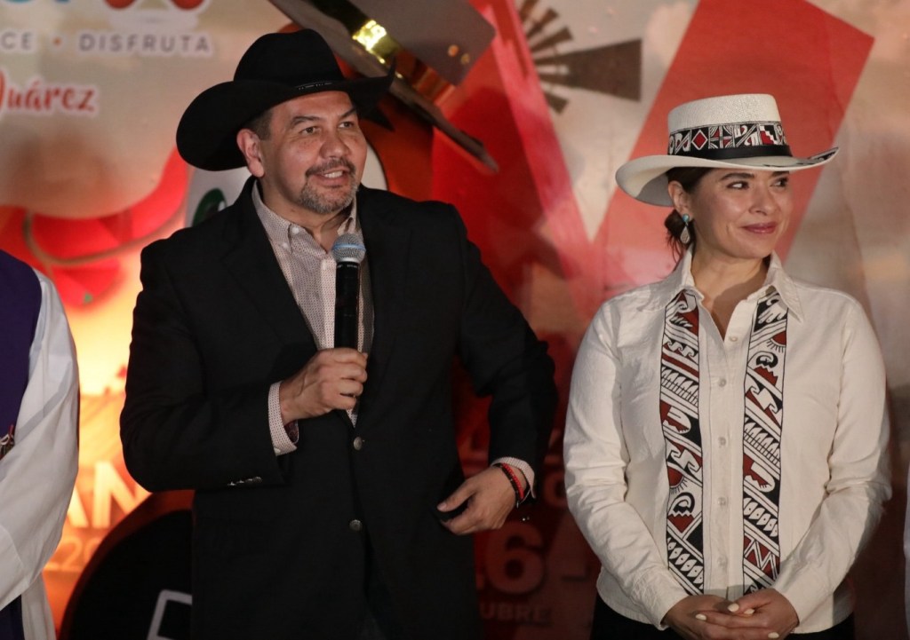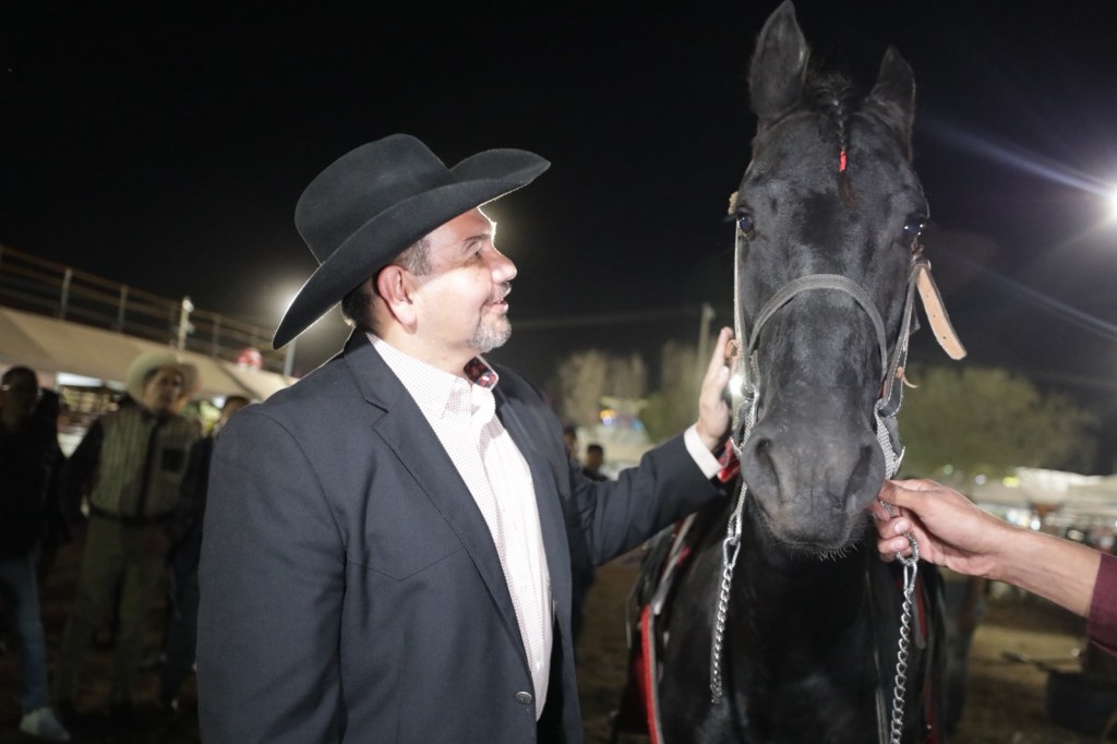 En el acto, Pérez Cuéllar recorrió las exhibiciones de ganado vacuno y convivió con productores locales, acompañando a los organizadores y representantes de asociaciones ganaderas de Juárez y Chihuahua.