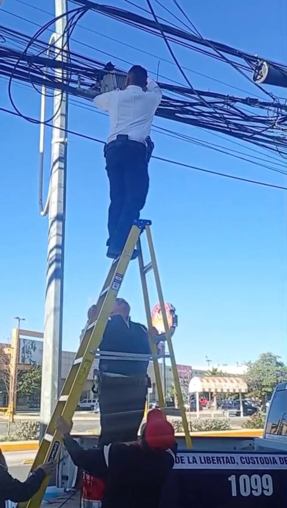 Agentes de Seguridad Vial rescataron a un gatito que quedó atrapado entre cables de electricidad sobre el bulevar Manuel Gómez Morin, en Ciudad Juárez.