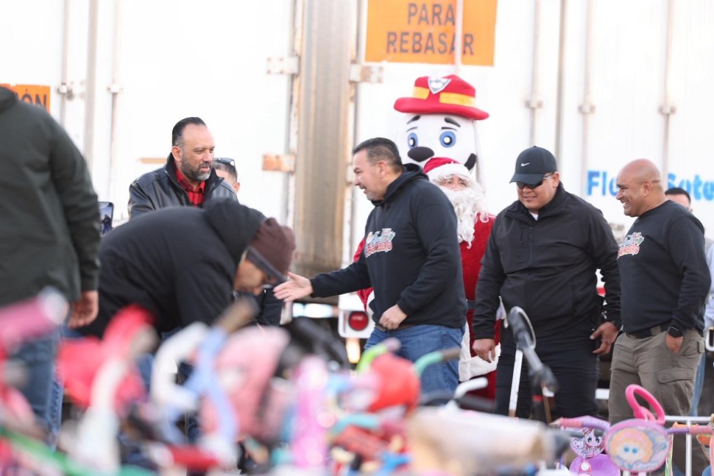 Brenda Morales señaló que viajaron desde Riberas del Bravo y agradeció donaciones al Departamento de Bomberos para continuar la entrega de juguetes en Navidad y la espera en el parque.