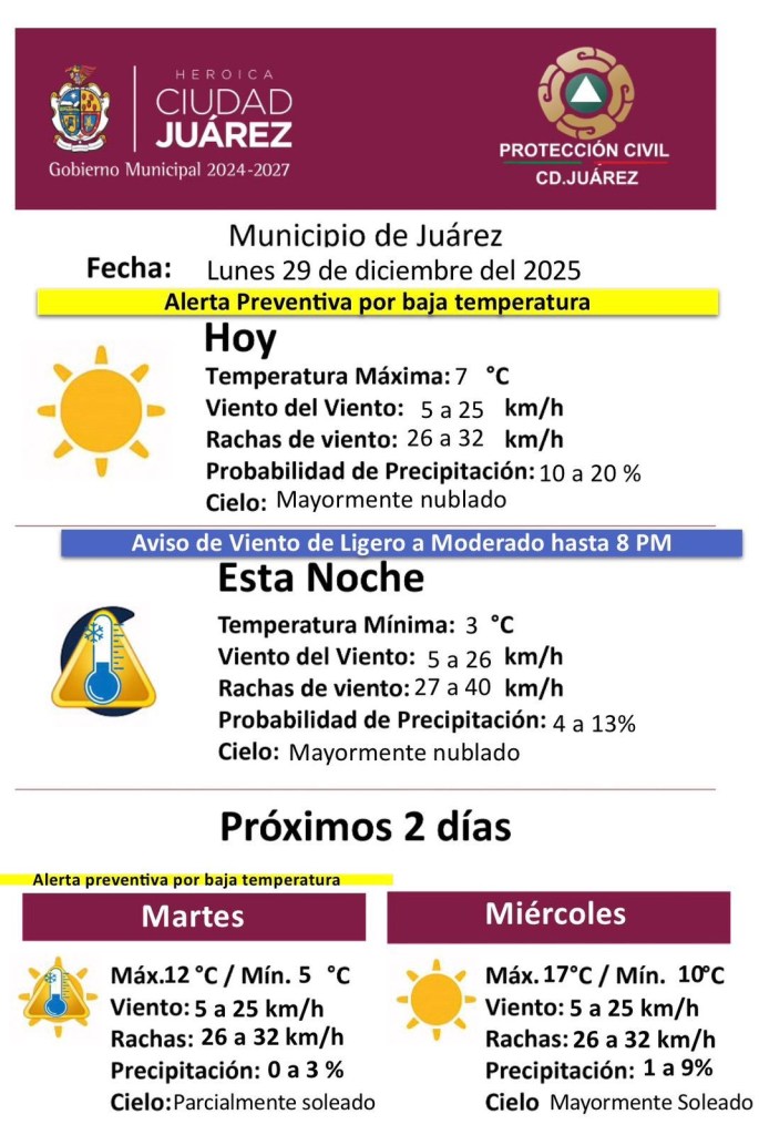 Protección Civil emitió alerta preventiva por bajas temperaturas este lunes, con máxima de siete grados, viento constante, rachas moderadas, cielo nublado y probabilidad de precipitación baja durante el día, según reporte oficial municipal emitido hoy.