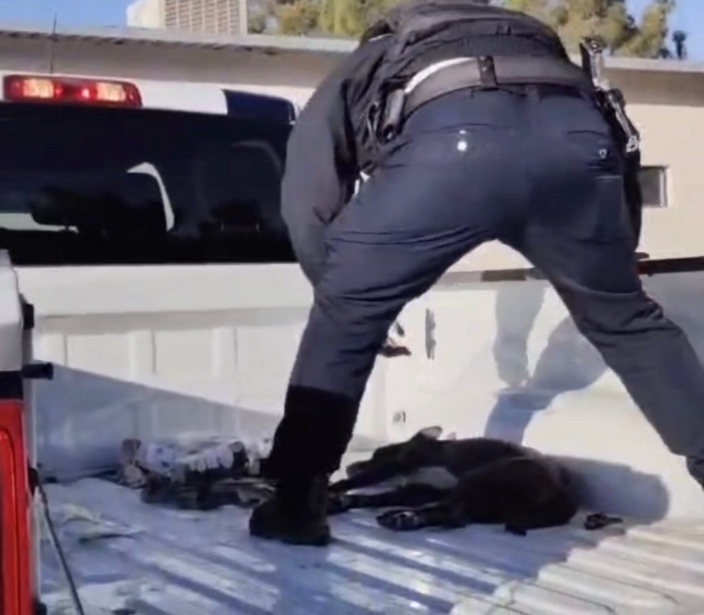 Los oficiales subieron al canino a la patrulla para trasladarlo a Bienestar Animal. Médicos evaluaron las lesiones internas antes de decidir el procedimiento final de eutanasia. .