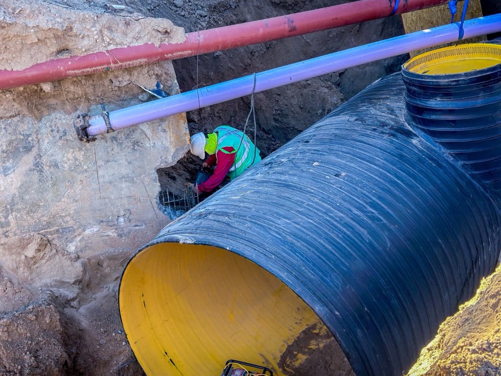 La Junta de Agua y Saneamiento de Juárez reporta un avance del noventa y seis por ciento en la obra del Colector Viñedos. Los trabajos concluyen pronto.